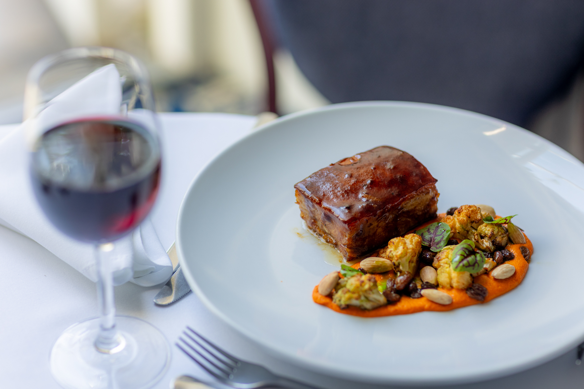 Glazed pork belly delivers a comforting yet refined plate, with roasted cauliflower, romesco, almonds, and sweet sherry-soaked raisins creating a perfect balance of flavours and textures.