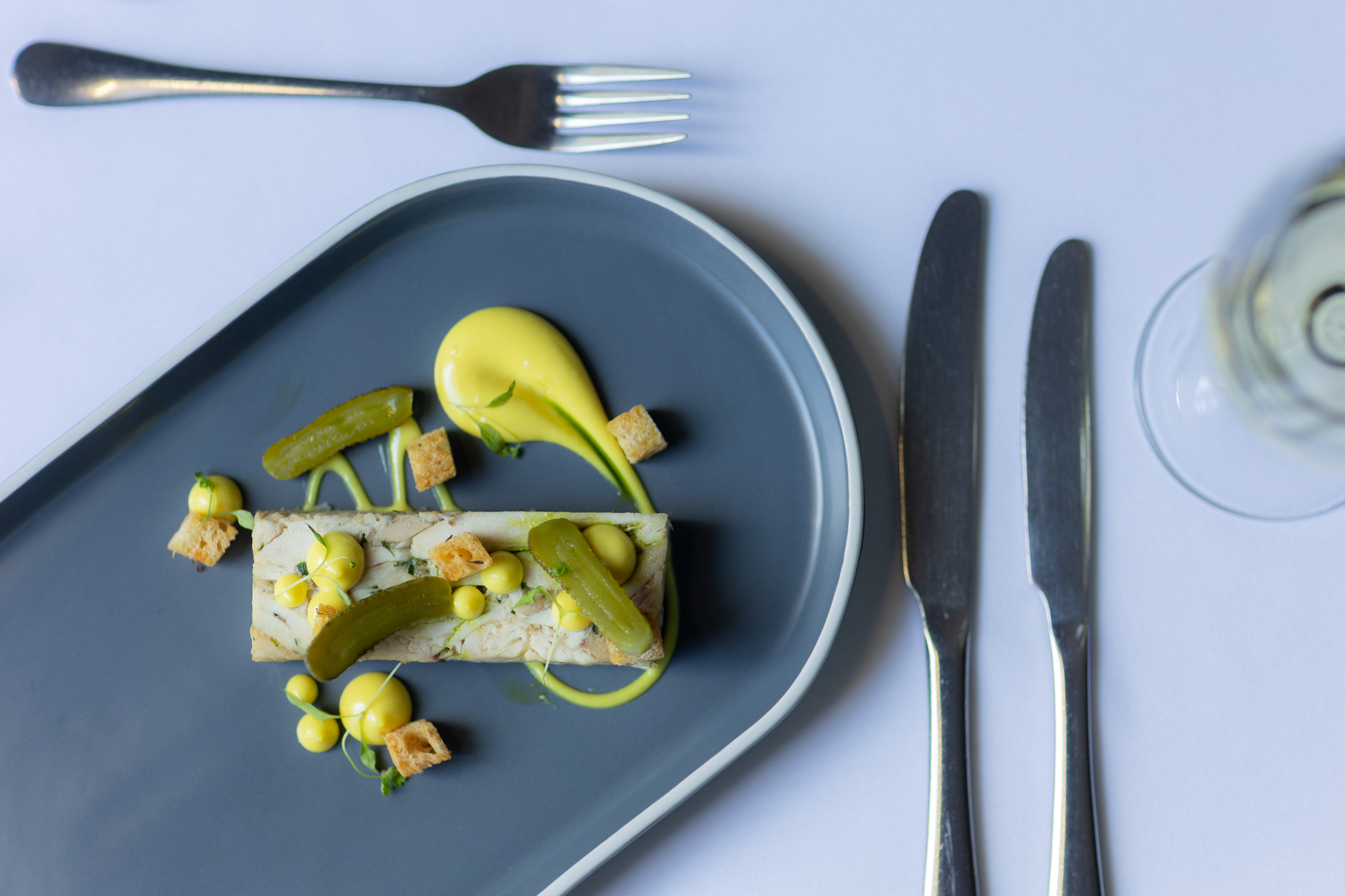 The chicken and tarragon terrine is classic and elegant, paired with cornichons, Dijon mayonnaise, and sourdough croutons for a perfectly balanced dish.