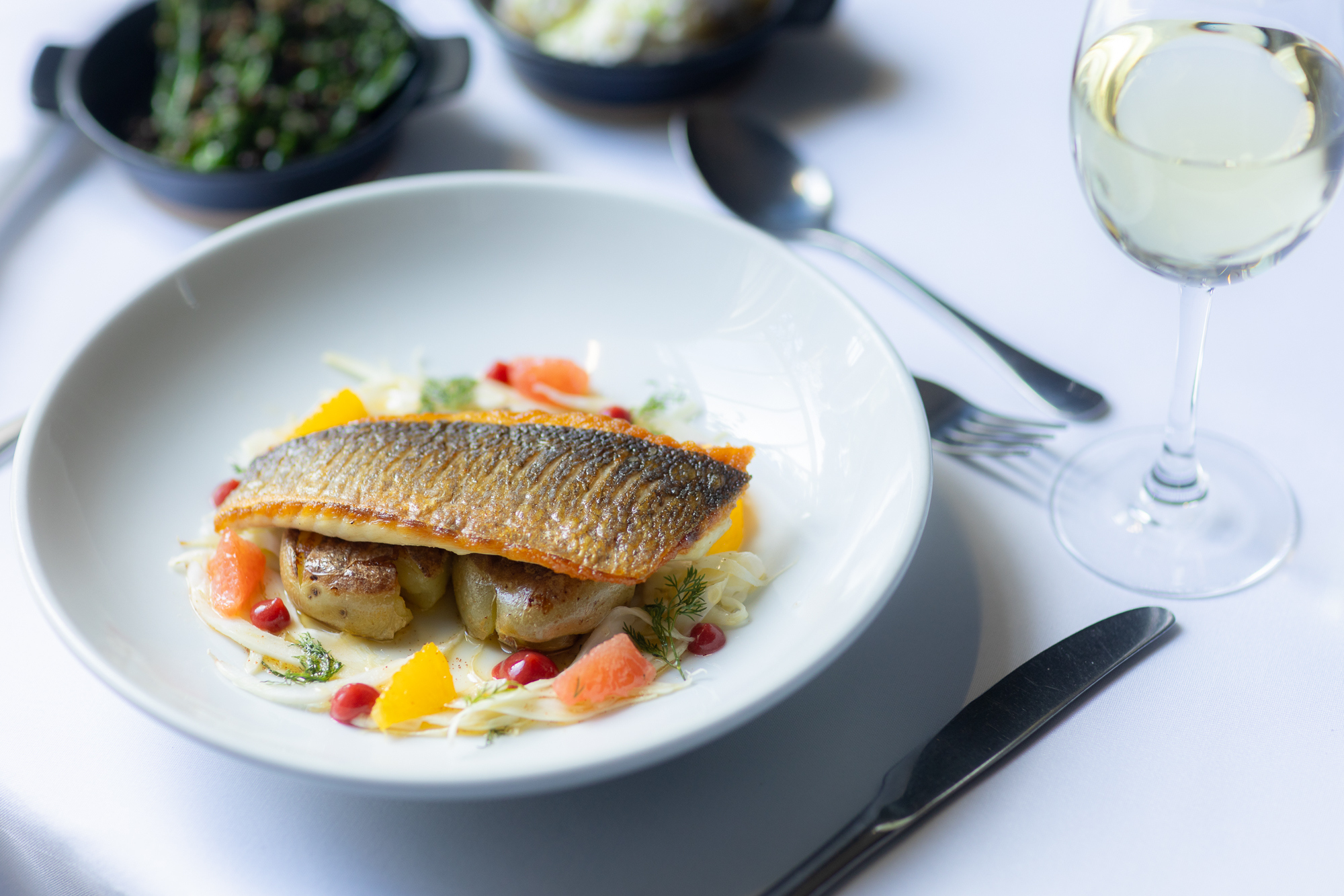 Seabass is served with crushed new potatoes, pickled fennel, citrus segments, and dill, finished with brown butter for a dish that feels both light and indulgent.