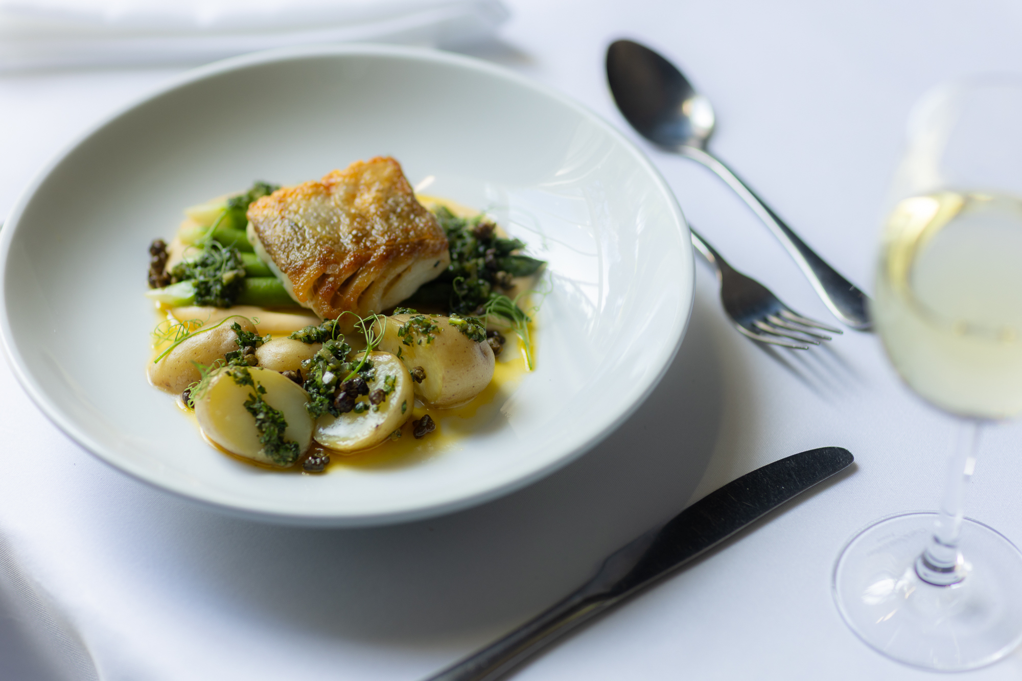 The chef’s daily fish is served with buttered new potatoes, asparagus, and white bean purée, finished with salsa verde and crispy capers for a dish that is light yet full of flavour.