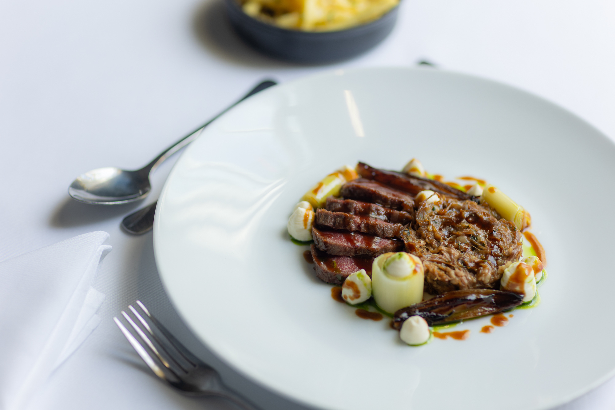 The lamb duo showcases two cuts, tender shoulder and cannon, paired with whipped ricotta, confit leeks, and charred shallots, offering depth, richness, and elegance.