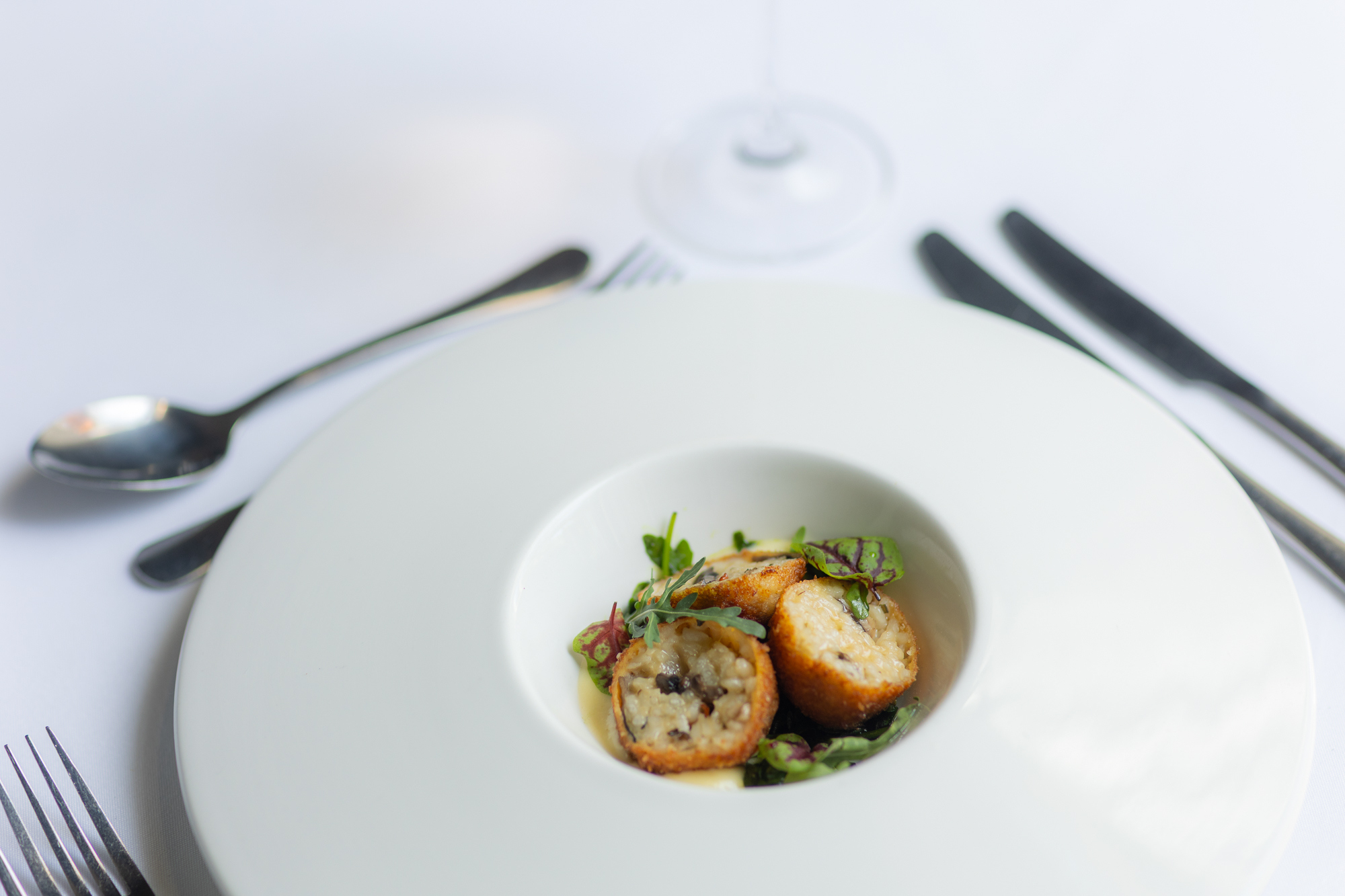 Wild mushroom arancini offers a more indulgent start, crisp on the outside with a creamy centre, complemented by parmesan cream and fragrant wild garlic oil.