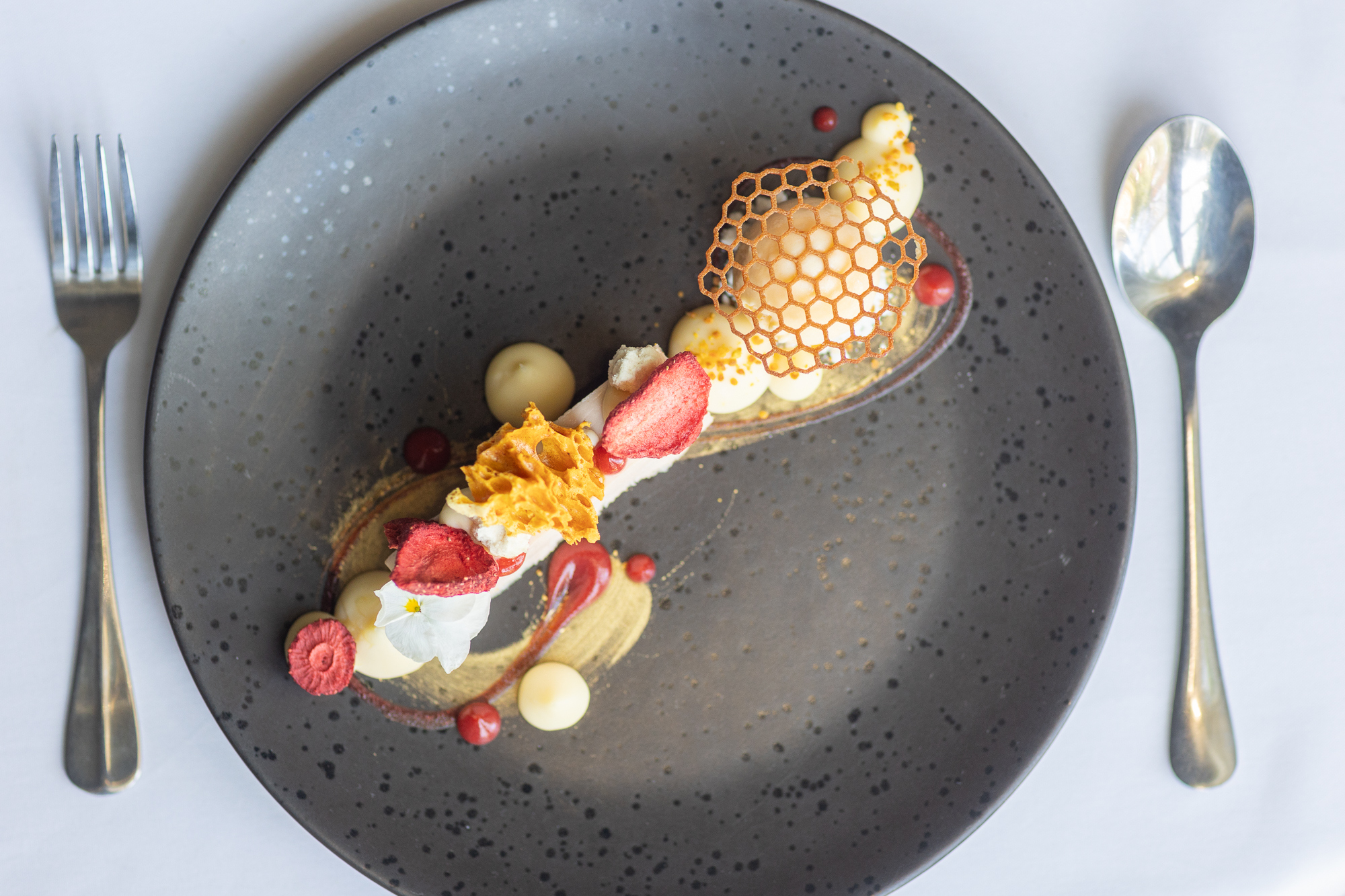 Strawberry cheesecake brings a fresh seasonal element, complemented by honey ice cream and kaffir lime.