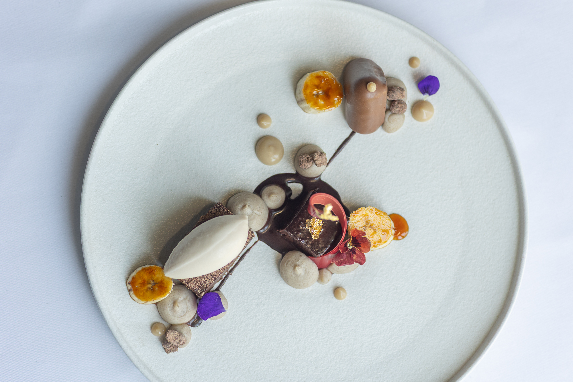 For something richer, the dark chocolate marquise is paired with banana, whiskey, and sea salt, creating a deep, indulgent flavour profile.