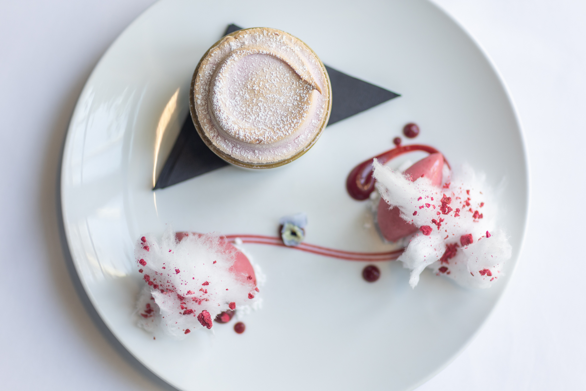 A raspberry soufflé provides a delicate and airy finish, served with raspberry sorbet and crushed meringue.